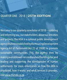 The past month has been an eventful one for the country. What we can celebrate is the fact that our constitutional democracy is maturing and has a seamless process that will stand the test of time. For the human settlements sector, the important news is the change of the Minister. On that note, I congratulate Honourable Nomaindia Mfeketo on her appointment as the new Minister of Human Settlements. We are looking forward to her term of office and the support I am sure the sector will bring to her. She has extensive experience as a Member of Parliament and has played various roles in housing, including Development Action Group (DAG) - an organisation focusing on housing options and housing development. Among her many achievements, she was also the first black woman to become Mayor of the City of Cape Town. I also congratulate Honourable Lindiwe Sisulu on her new role as Minister of International Relations and Cooperation. The work of government has not stopped and we continue to chase our targets as per the Annual Performance Plan (APP) for 2017-18 as we wrap up the fourth quarter of the financial year. At the same time, we are finalising our APP for the 2018-2019 financial year - please look out for these on our website (www.thehda.co.za) soon. We have also published there our new strategy and plan on stakeholder and intergovernmental relations - I encourage you to farmilarise yourself with these. There are great expectations on the HDA by our Executive Authority. The implementation of the Catalytic Projects programme remains at the centre of our APP. Related to this is the work we have begun on the Priority Housing Development Areas (PHDAs). We have, over the years, delivered sterling work in various projects where we had the responsibility of being an implementing agent or project manager. Soon, we will be planning and rolling out a vibrant publicity campaign around the catalytic projects. We are looking forward to a busy and productive tenure!